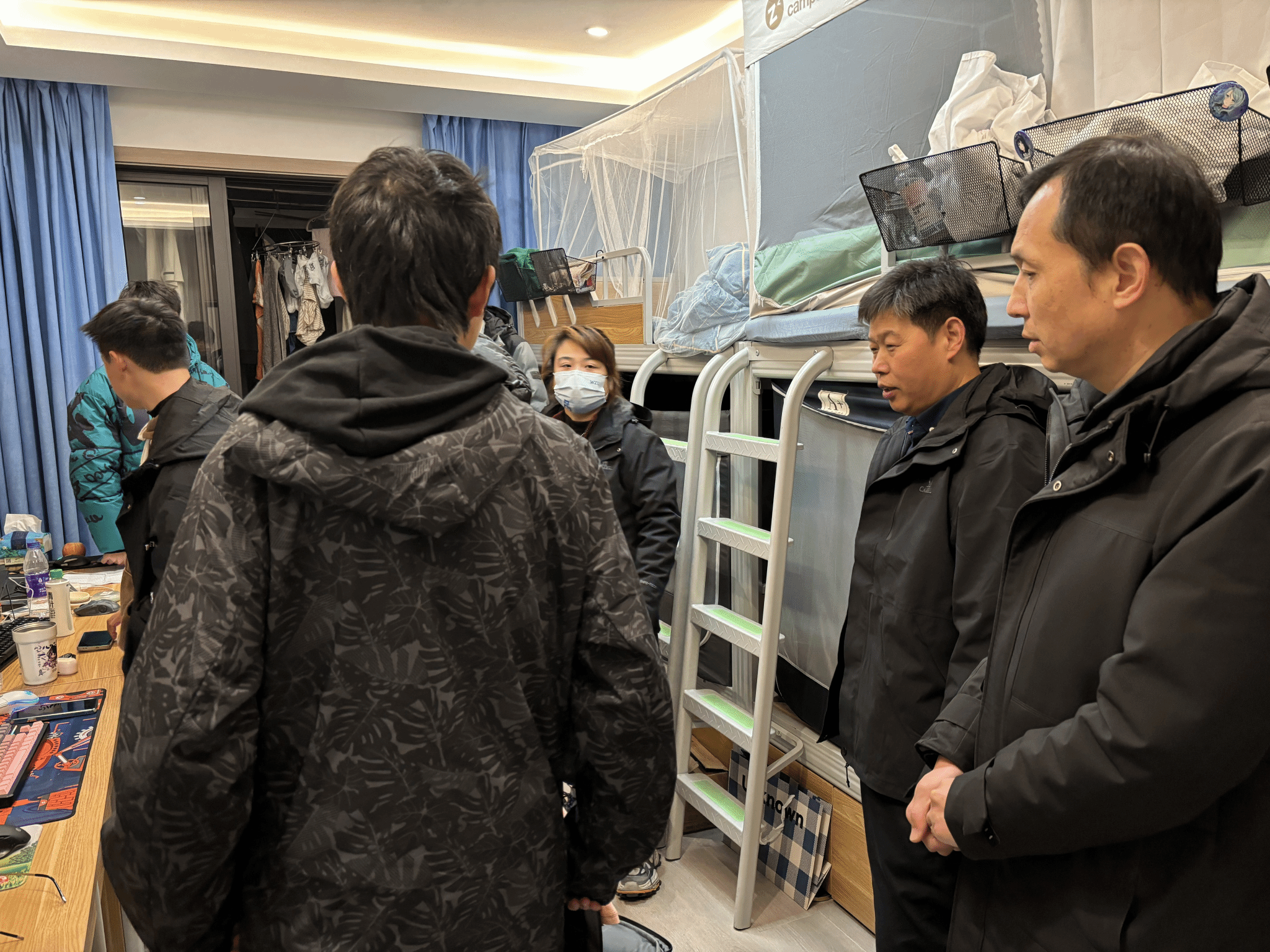检查从晚上七点半正式开始。马增岭院长和潘从义书记带领检查组深入每一间宿舍,逐一检查室内卫生状况和安全隐患。从电线是否私拉乱接,到宿舍是否存放违规电器,再到物品摆放的整齐程度,检查组都逐一核查。