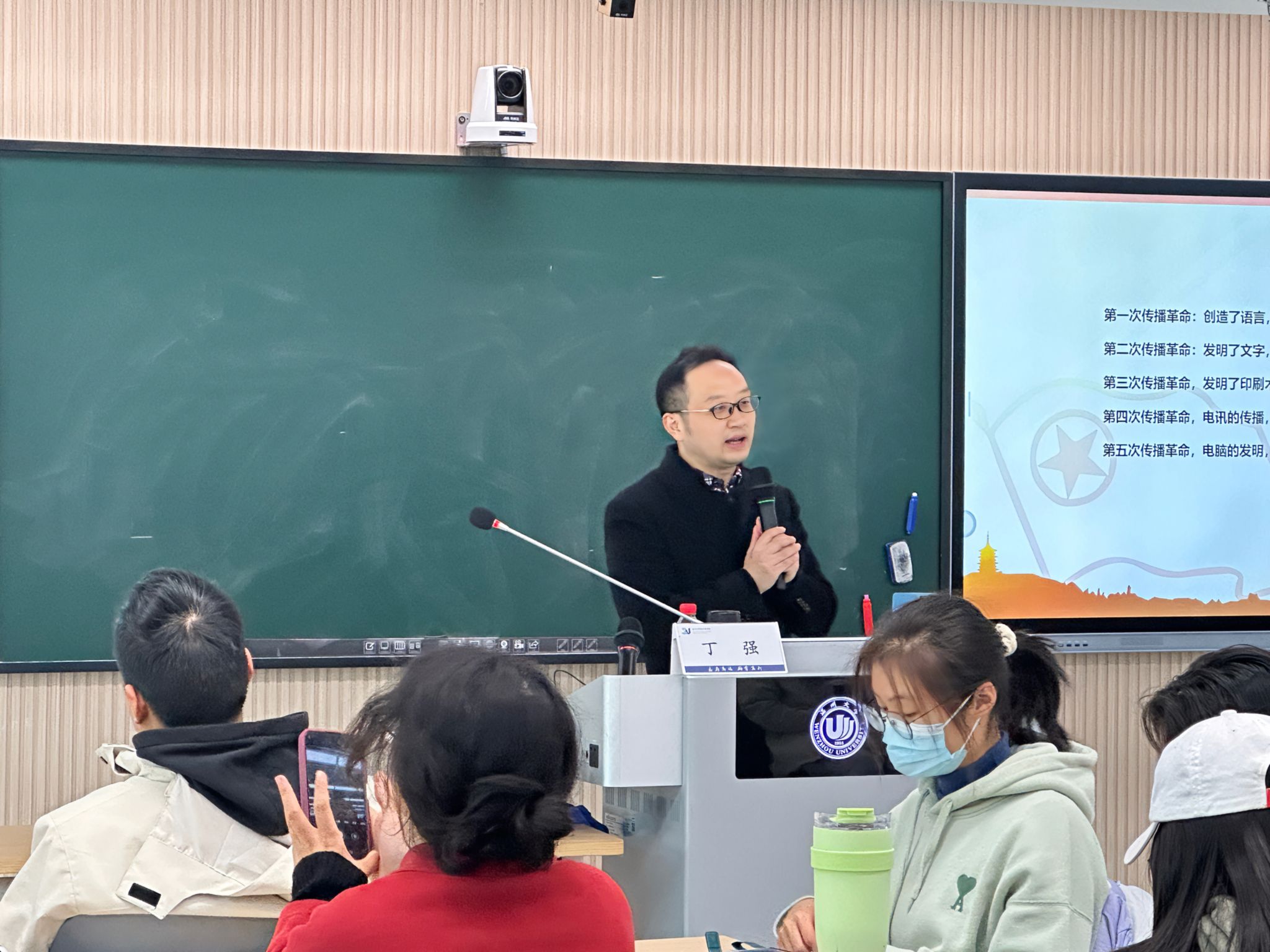 讲座中,丁老师提到我们人类的文明史从某种意义上来说其实就是人类使用传播途径的演化史,这个传播大概经历了语言的产生、文字的发明、印刷术的出现、电讯革命、电脑的发明五次革命。从PC端到移动端,再到智慧互联再发展,我们应该掌握这个潮流和趋势。