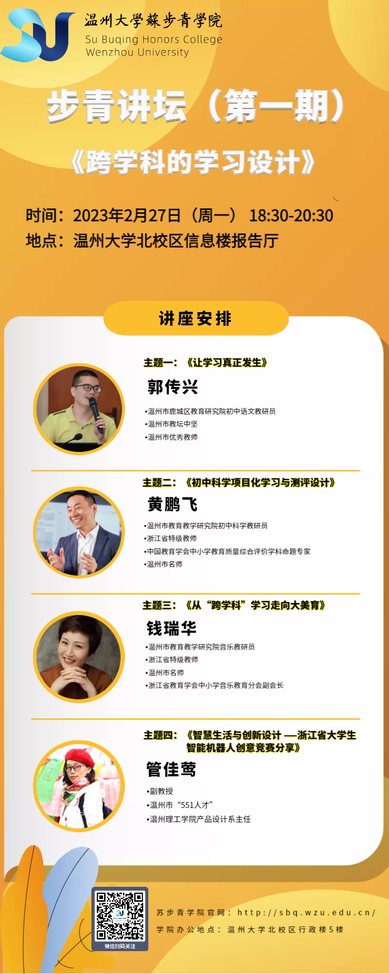 第一期“步青讲坛”系列讲座于北校区信息楼报告厅举行。本期讲座以“跨学科的学习设计”为主题,邀请到四位温州市资深教研员和专家做讲座报告。讲座由胡珏老师主持。