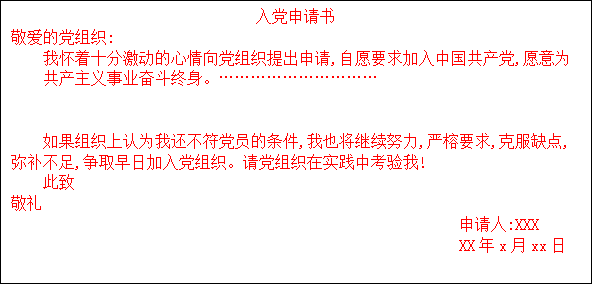 (3)正文。这是入党申请书的主要部分,一般写以下内容①为什么要入党(主要写自己对党的认识、政治信念和入党动机,以及在这些方面思想变化的过程);②本人的基本情况(主要写自己成长的经历、政治历史问题、受过何种奖励和处分,以及思想、工作、学习和作风等方面的情况);③家庭主要成员和主要社会关系情况(主要写其职业、政治情况、与本人的关系等。此项内容也可附于申请书后);④怎样积极争取入党(主要写怎样正确对待入党问题,以及怎样以实际行动积极争取入党和接受党组织的考验)。