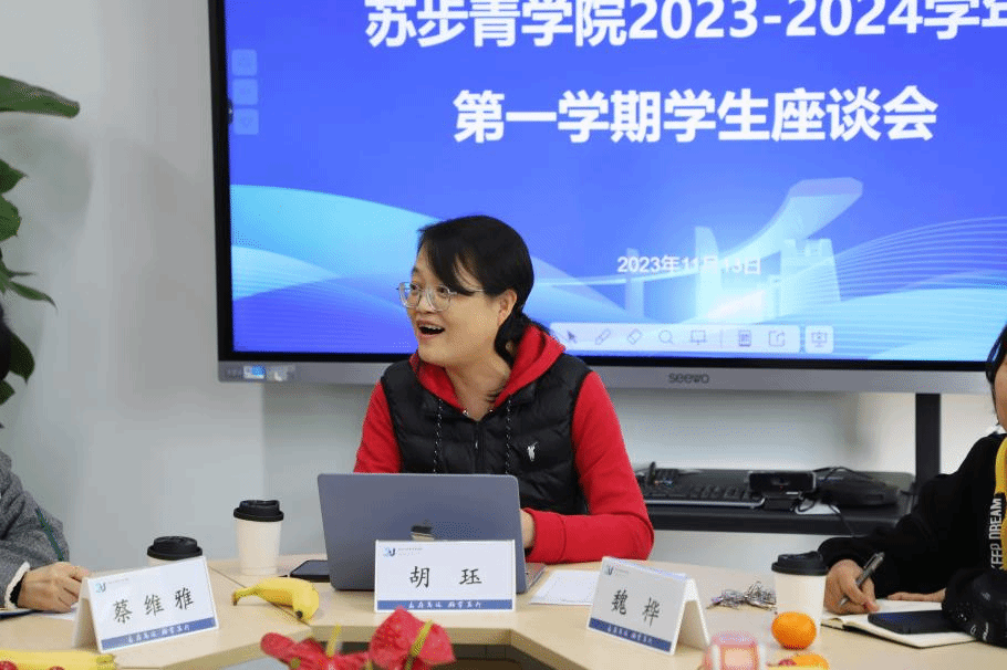 座谈会上,胡珏老师首先对全体新生填写的期中教学检查问卷结果展开分析,就4个专业班级的学习压力、学风建设、课程教学等问题进行重点说明。胡珏老师表示,学院高度重视同学们的反馈和意见,并对教学过程中存在的问题进行了积极调整,说明了学院接下来的工作规划。