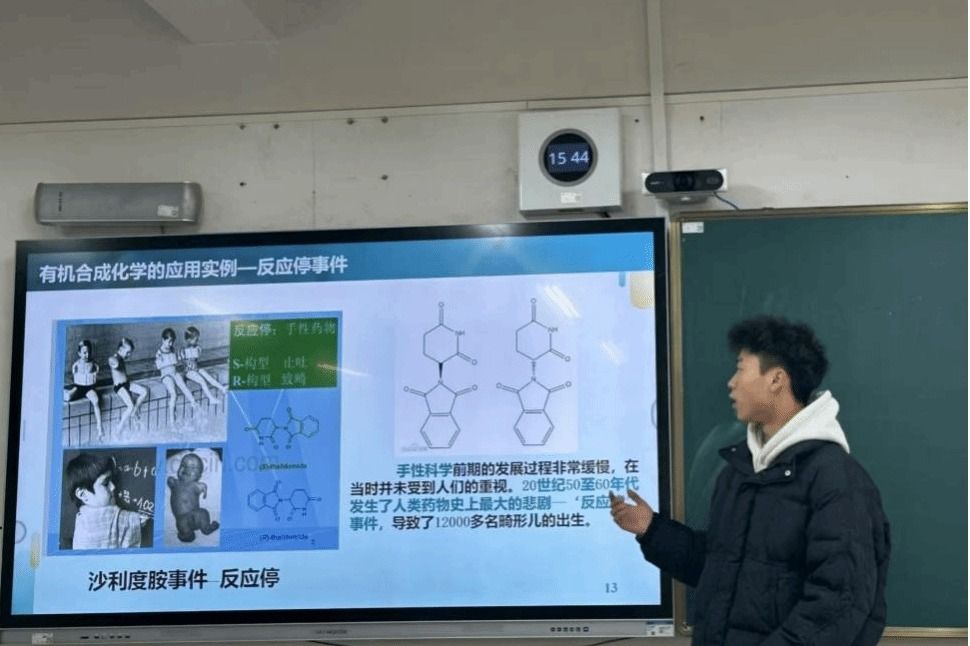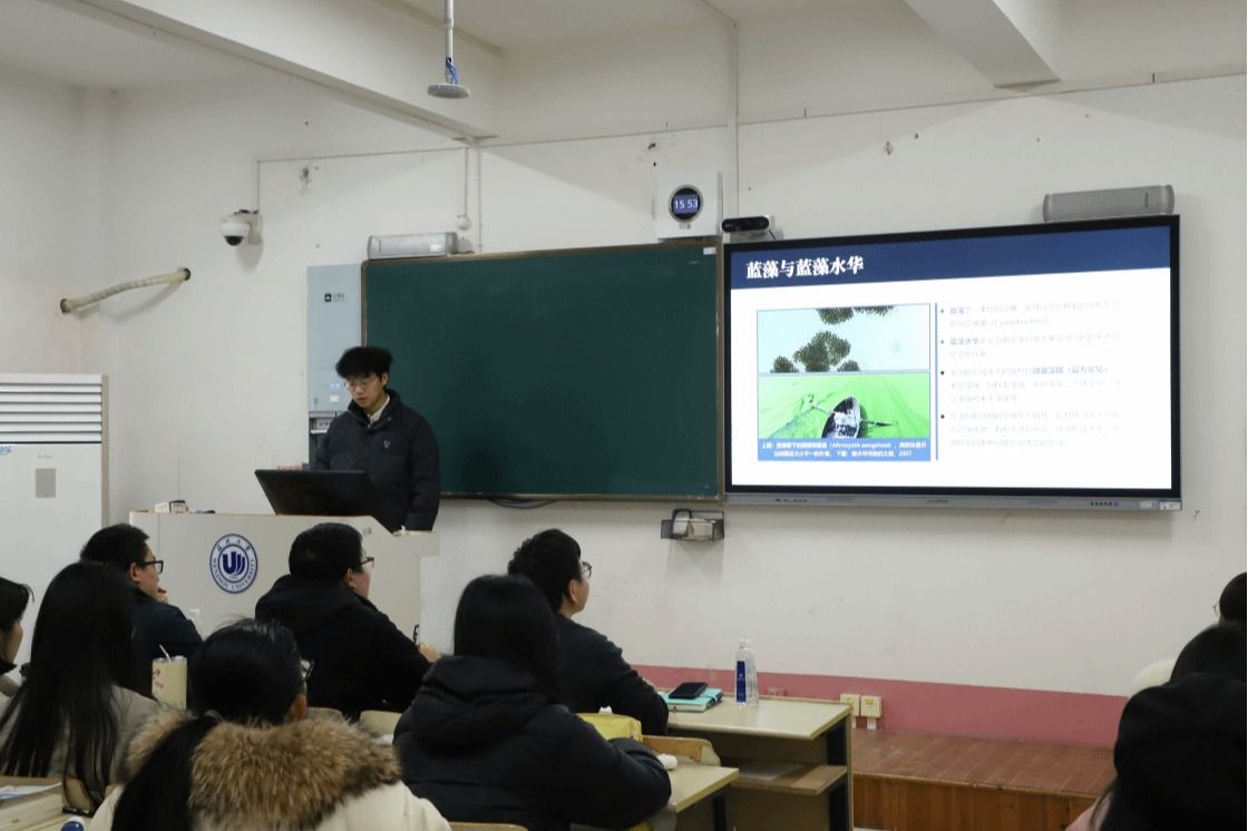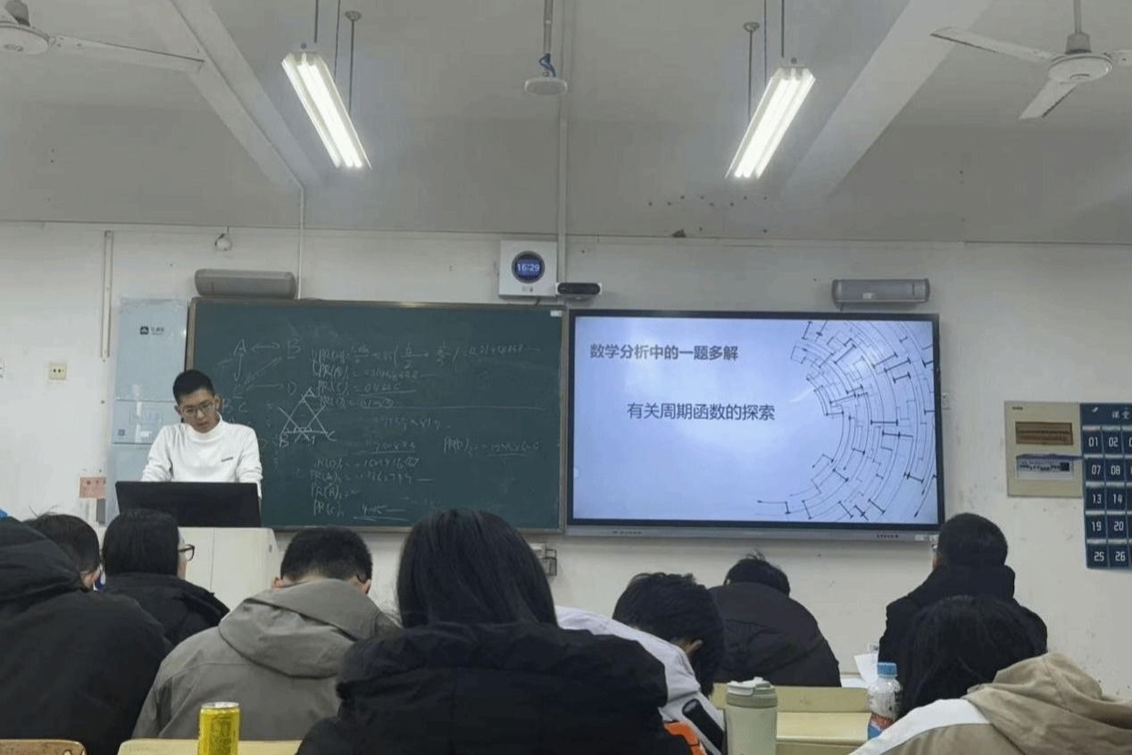 数学家精神为切入点,着重展示了数学分析中的一题多解,并且对周期函数的探索方法进行推广应用,体现了数学专业严谨钻研的精神气质。来自 24步青化学的柴苏航同学则着眼于有机合成化学这一课题。他在汇报中提到,有机化学的研究对象是碳化合物,是与生命有关的化学。来自24步青生物的蒋建豪围绕蓝藻水华与微囊藻毒素的生物学与生态学功能进行阐述。