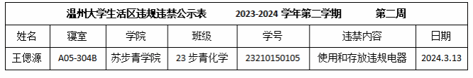 本学期以来,学校开展“安•净”专项行动,对宿舍区域进行安全大检查。根据学校第三周寝室检查结果,排查到王偲源同学违规使用电器,现给予院级通报批评,具体情况如下: