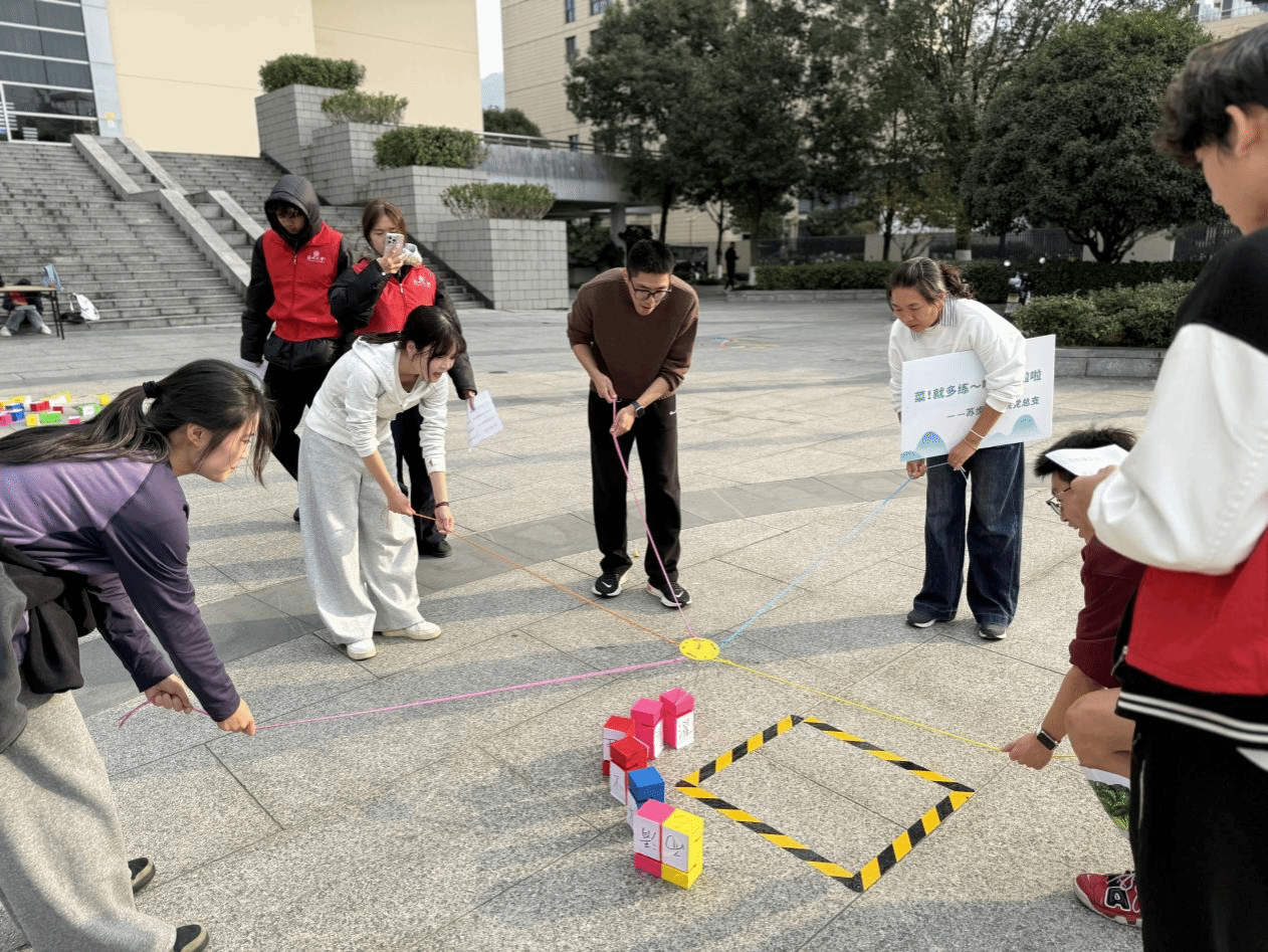 随着发令声响,选手们迅速展开地图,精准定位打卡点坐标,在奔跑中拉开了这场智慧与体能的比拼序幕。比赛中,我院师生充分展现了极强的团队协作能力。如在“纸杯传球”环节里,大家俯身屏气,紧盯乒乓球的动向,用均匀的气息和精准的节奏,让小球在杯间顺利穿梭,即便偶尔失误,也立刻相互鼓励,迅速调整状态重新挑战。在“积木搭建”任务点,队员们围圈讨论策略,有人负责指挥调度,有人精准操控彩绳,双手紧握绳索默契配合,将彩色积木稳稳叠起,每一层搭建都凝聚着集体的智慧。